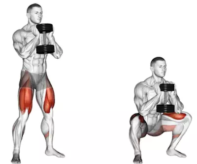 How to: Start this movement with one dumbbell and hold it vertically against your chest. You will have to grip the top part of the dumbbell with your fingers wrapped around the weight and ensure your elbows are pointed toward the ground. Perform a squat by bending at your knees and slowly sinking into the squat until your thighs are parallel with the floor. Engage your core and glutes and drive your feet into the floor to reach the top of the squat. Squeeze quads and glutes and the top of the squat and perform desired amount of reps.