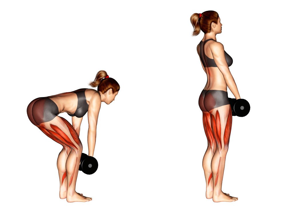 How to: Grab a set of dumbbells and stand about shoulder width apart. Hold the dumbbells with your palms facing inward. You will then engage your core and bring your shoulder blades together. With a slight bend in your knees and straight back, hinge at the waist and lower the weights to the floor. You should feel a tight pull or stretch in your hamstrings as your move your hips backwards.