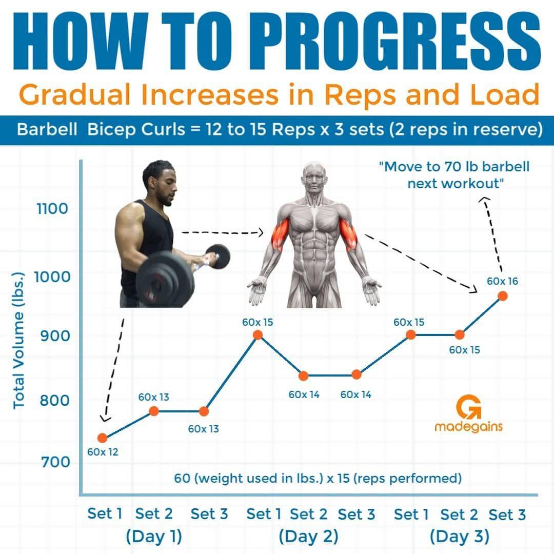 To put progressive overload more into perspective, say you begin benching with just the 45 lbs bar. Then, the next week, you add 10 lbs and/or 25 lbs to the bar. You have essentially progressed forward by increasing the weight rather than going back by decreasing the load.